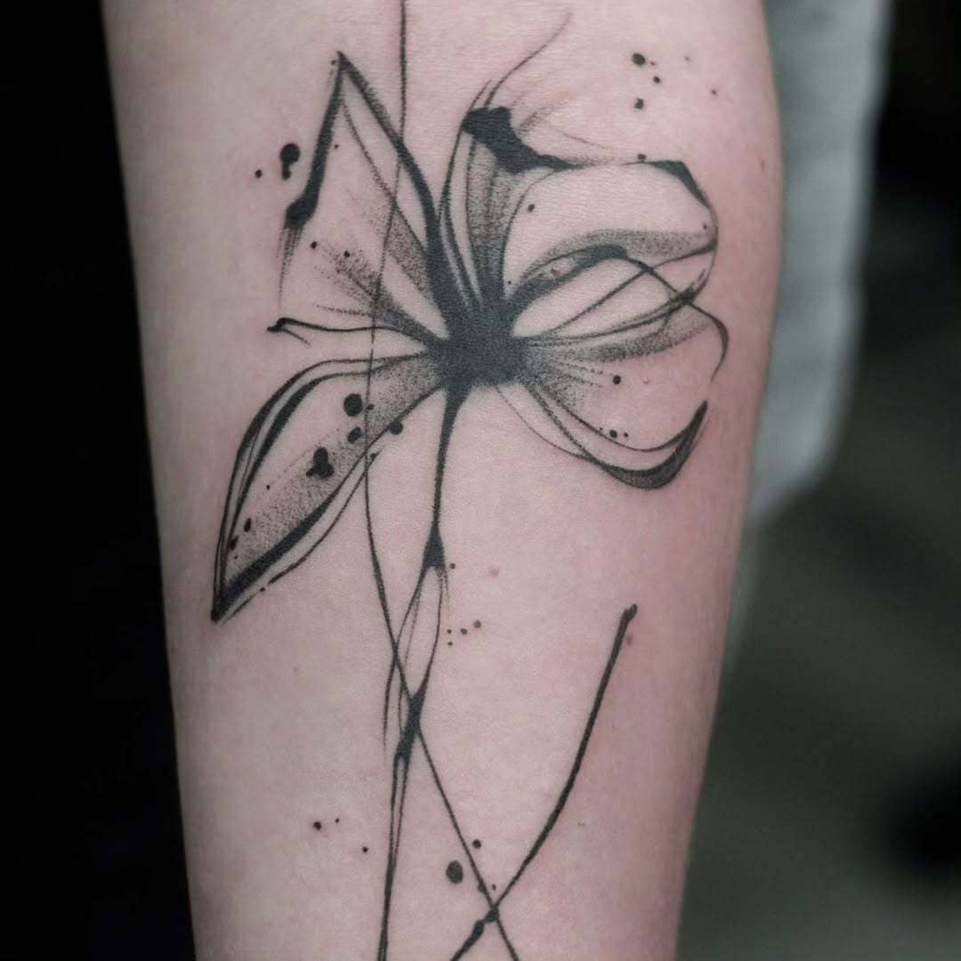 An expressive abstract flower tattoo formed with fluid ink-like strokes and airy linework. Soft dot shading blends into bold brush accents, creating depth while preserving a light, painterly feel. Splattered ink details and elongated flowing lines give the composition motion and spontaneity, merging floral elegance with modern graphic abstraction.
