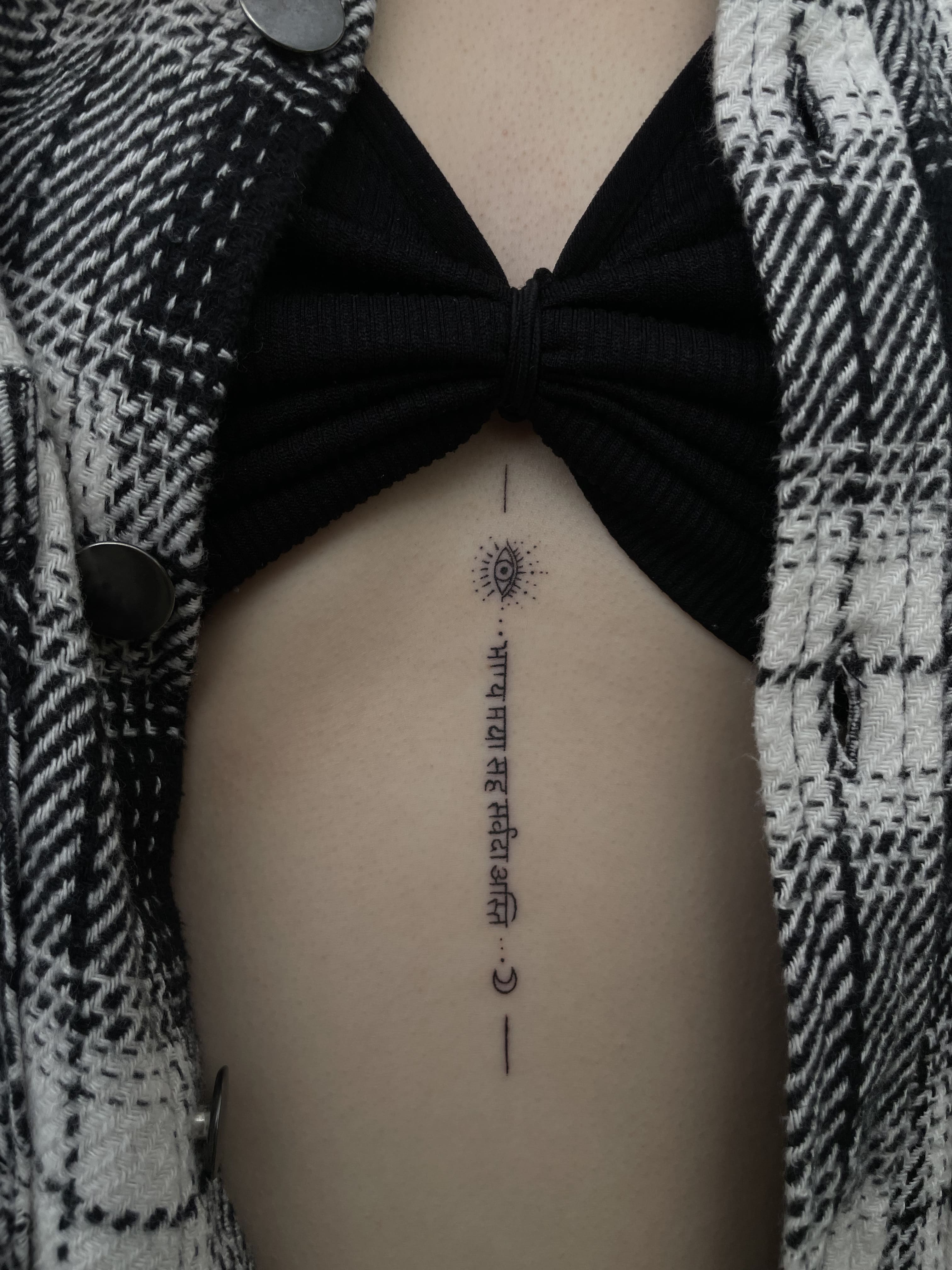 Running precisely along the spine, this minimalist composition feels both intentional and deeply personal. A delicate eye sits at the top, radiating subtle energy, while the vertical script flows downward like a quiet mantra etched into the body. The placement enhances the natural symmetry of the back, creating a sense of balance and alignment. Fine linework keeps the piece light and refined, allowing every detail — from tiny dots to clean lettering — to breathe. The addition of a crescent and minimal symbols at the base ties the composition together, giving it a soft, spiritual undertone without overwhelming the simplicity. It’s a piece that speaks quietly, yet carries strong meaning through form, placement, and precision.