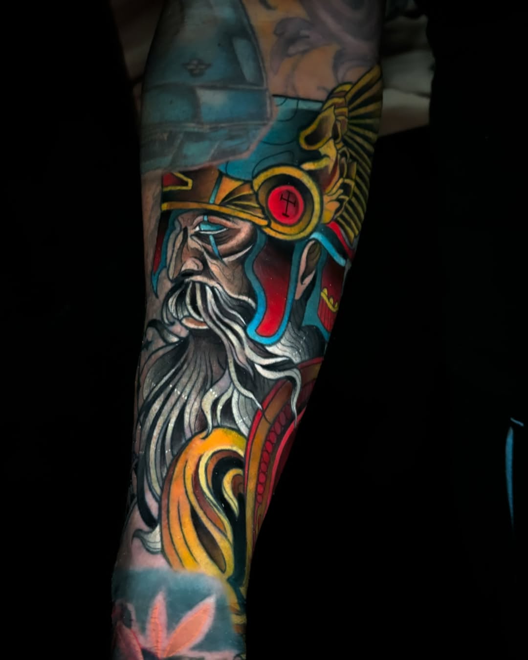 A bold neo-traditional tattoo featuring the powerful portrait of an ancient warrior with a long flowing beard and ornate helmet. The design uses strong outlines and saturated colors to create a striking focal point, while turquoise and red accents highlight the warriorβs facial markings and armor details. The stylized beard flows downward in dynamic curves, adding movement and depth to the composition. This piece also functions as a skillful cover-up, using layered shading and strategic color placement to conceal older work beneath while transforming it into a cohesive and visually powerful design. The result is a dramatic tribute to mythic strength and timeless warrior symbolism.