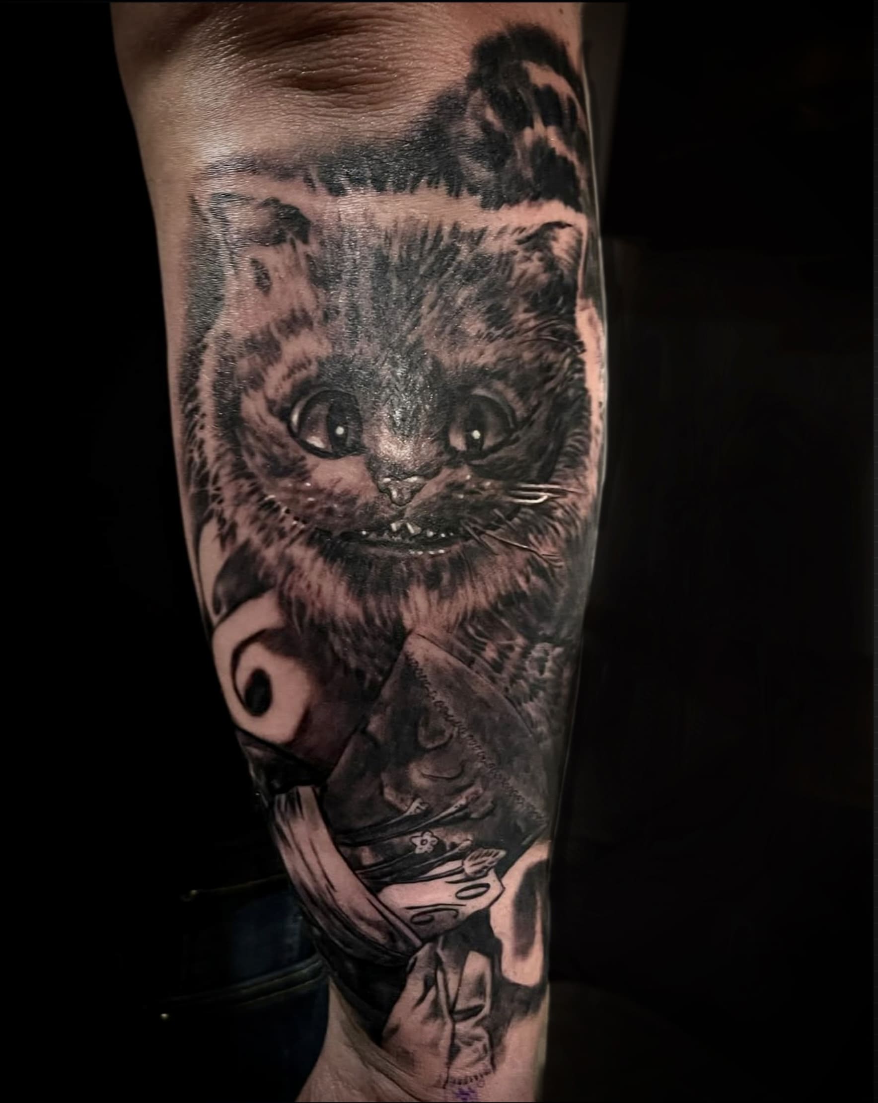 Emerging from deep shadows, this tattoo brings the iconic Cheshire Cat to life with an eerie yet captivating presence. The wide, knowing grin and glowing eyes create a hypnotic focal point, blending playfulness with a slightly unsettling edge. Executed in rich black and grey, the piece uses contrast and texture to build depth, making the fur appear soft while the expression feels almost alive. Subtle background elements enhance the surreal atmosphere, giving the impression that the character is fading in and out of reality. Flowing along the arm, the composition follows the natural shape of the body, amplifying its visual impact and making the design feel immersive. It’s a bold tribute to a character that exists somewhere between imagination and darkness.