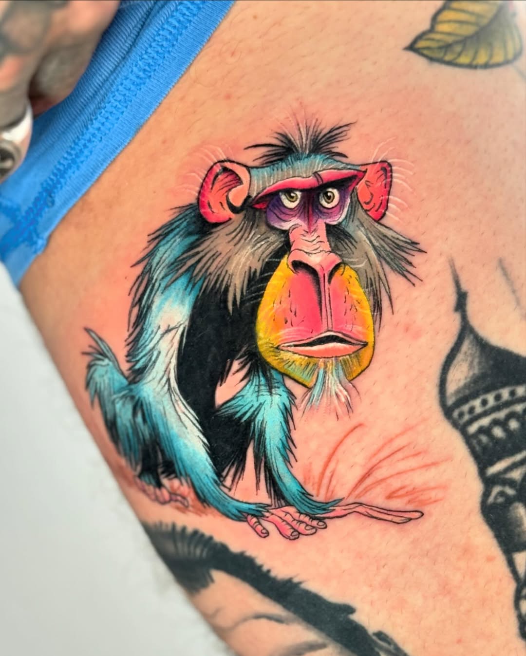 Vibrant illustrative tattoo of a mandrill featuring striking natural facial colors and expressive character detail. The piece blends bold linework with painterly color transitions, emphasizing the animal’s intense gaze and iconic multicolor muzzle. Dynamic fur texturing and saturated pigments create a lively, eye-catching composition that balances realism with stylized illustration.