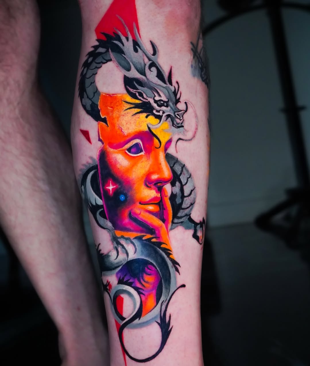 A bold surreal composition blending mythology and modern color aesthetics. A vivid neon-gradient human face emerges like a sculpted mask, glowing in saturated magenta, orange, and electric violet tones. A detailed black-and-grey dragon coils dynamically around the portrait, creating depth and motion while contrasting organic realism with graphic color fields. Geometric red accents and cosmic spark details amplify the futuristic mood, while flowing curves guide the eye through the vertical sleeve composition. The design merges Eastern myth symbolism with contemporary surreal colorwork.