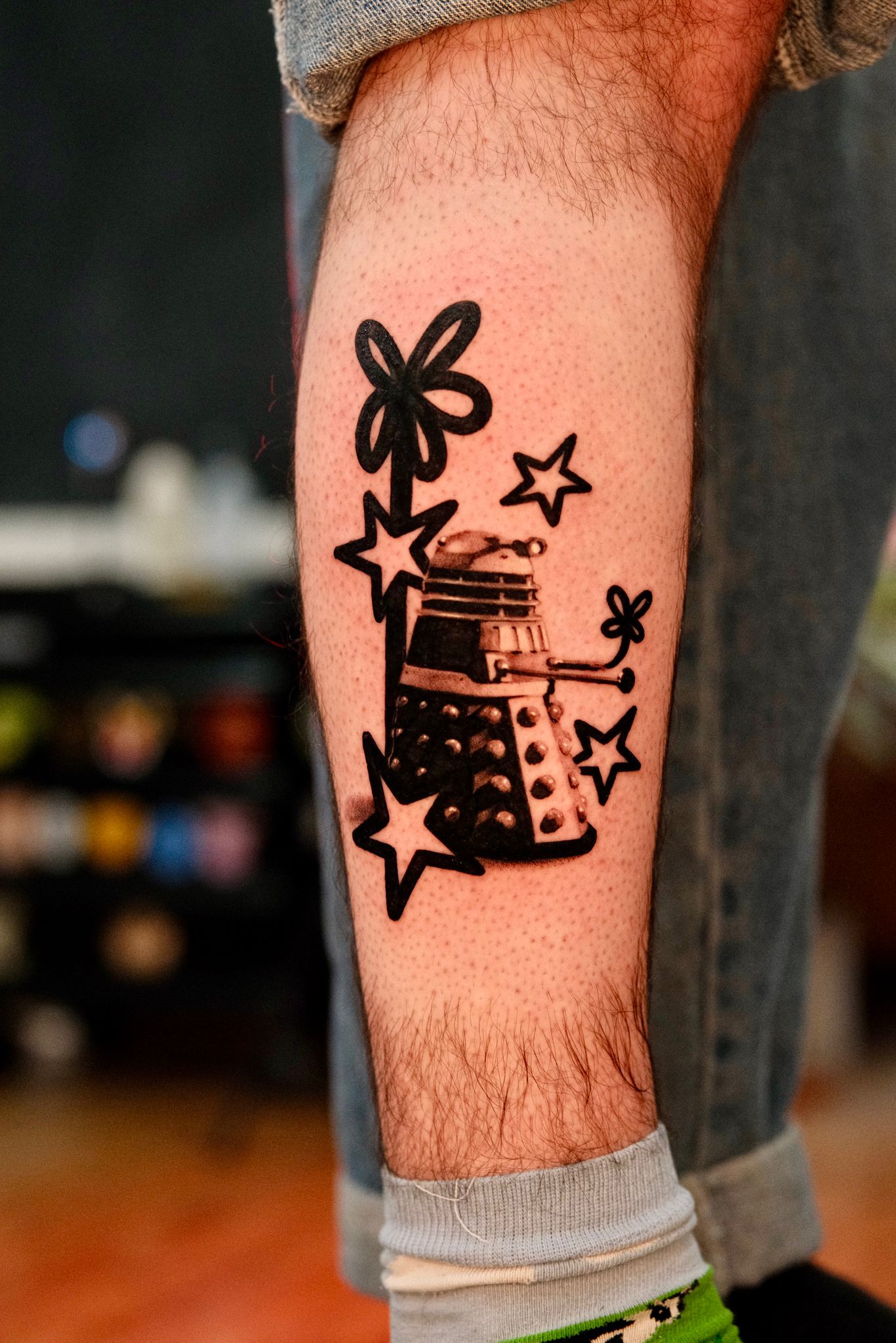 A playful blackwork tattoo blending sci-fi nostalgia with bold, graphic elements. The central figure features a stylized Dalek, rendered with clean lines and solid black shading, creating a strong visual anchor. Surrounding it are abstract stars and floral shapes, adding a whimsical, almost pop-art vibe that contrasts with the mechanical subject. The composition feels energetic and spontaneous, combining sharp geometric forms with loose, hand-drawn elements. This mix of structure and playfulness gives the tattoo a unique character, making it stand out as both a tribute to sci-fi culture and a modern artistic expression. Perfectly sized for the calf, it reads clearly from a distance while keeping a fun, unconventional aesthetic.