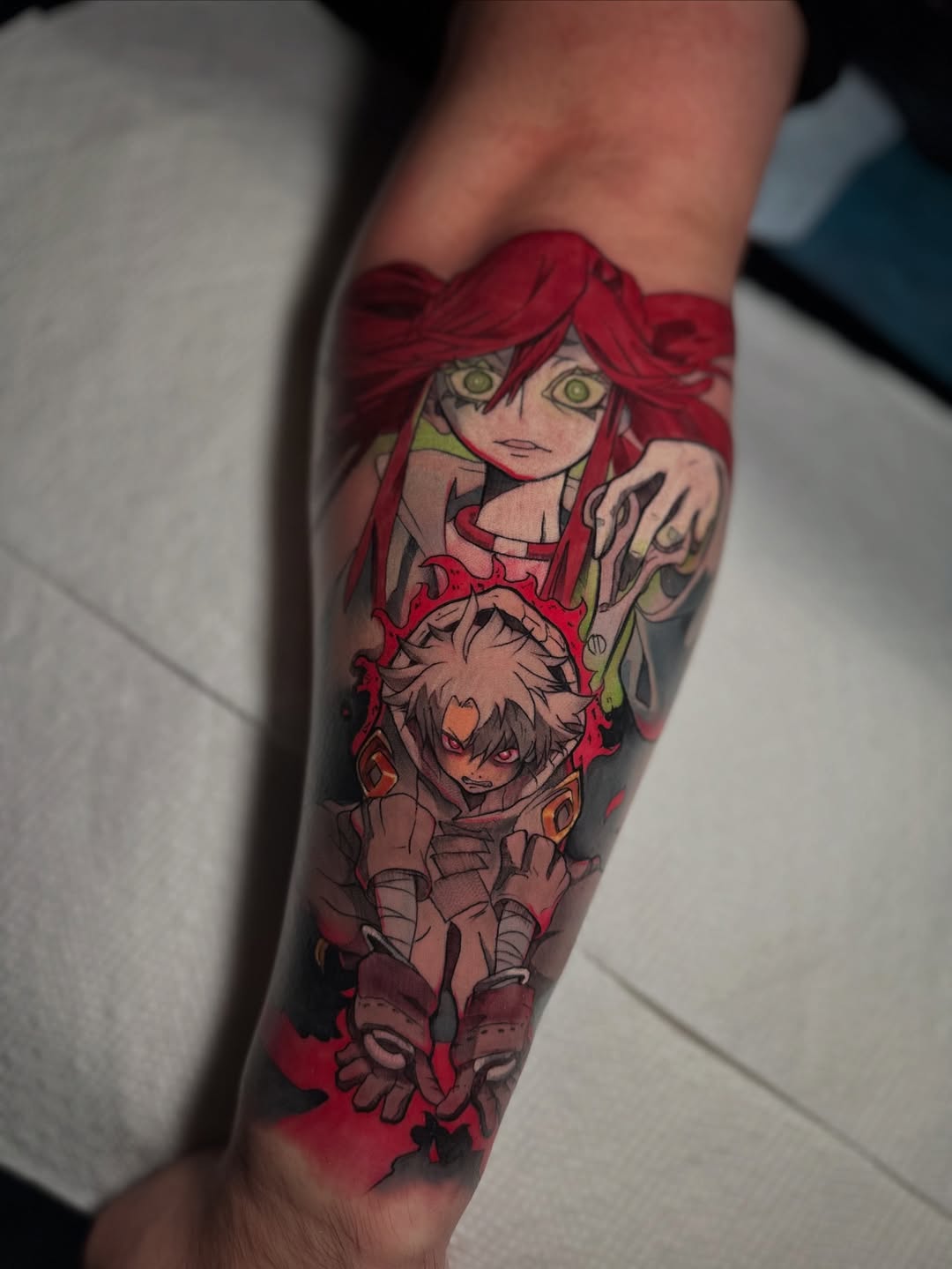 A striking full-color anime tattoo built in a vertical character stack that flows naturally with the limb. The composition pairs an intense upper portrait with a dynamic action pose below, creating strong narrative tension and visual depth. Deep crimson and shadowed blacks dominate the palette, contrasted by piercing neon-green eyes and subtle skin tones that enhance expression and mood. Clean, confident linework defines facial features and costume details, while smooth gradient shading and soft background fades add dimension without overpowering the characters. The result is a cinematic manga-style piece that blends emotion, motion, and bold color harmony into a cohesive sleeve segment.