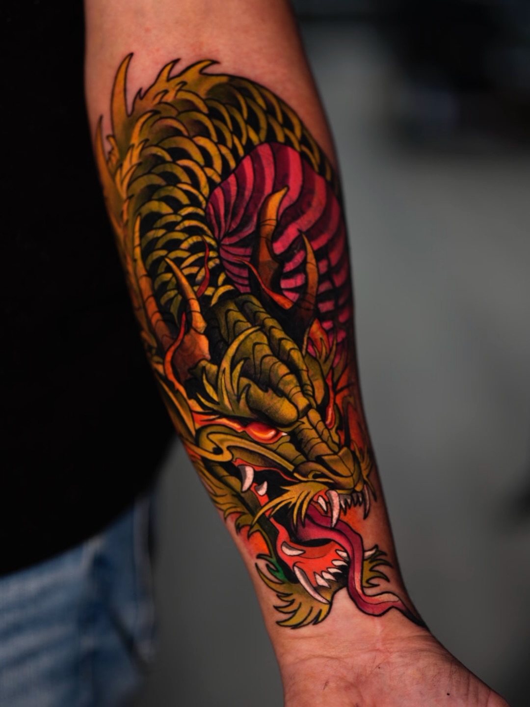 A powerful traditional-style dragon tattoo coiling along the forearm, rendered with bold linework and saturated earth-toned colors. The dragonβs scaled body curves dynamically through the composition, creating strong movement and flow that follows the natural shape of the arm. Deep greens and golden tones dominate the scales, contrasted by intense reds within the body and mouth, giving the creature a fiery, aggressive presence. The snarling head with exposed fangs and extended tongue adds drama and character, while layered shading enhances the texture of the scales and horns. Rooted in classic Eastern tattoo symbolism, the piece represents strength, transformation, and protection.