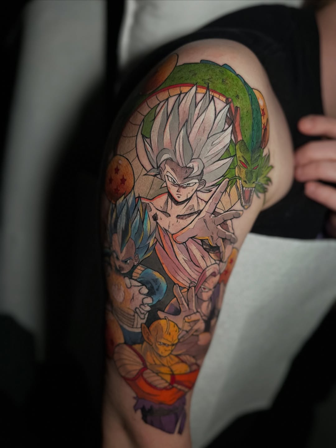 A bold, high-impact anime sleeve featuring an iconic Dragon Ball Z character lineup arranged in a powerful vertical composition. The central figure dominates with sharp, flowing hair and an extended hand gesture that drives motion through the piece, while supporting characters below add balance and narrative depth. Shenron coils across the upper section, framing the composition and tying the sleeve together with dynamic curvature that follows the arm’s anatomy. Saturated greens, fiery oranges, and electric blues create strong contrast against clean skin breaks, while smooth gradient shading and crisp linework preserve the authentic anime aesthetic. The result is a vibrant, story-driven sleeve that blends action, nostalgia, and cohesive character placement.