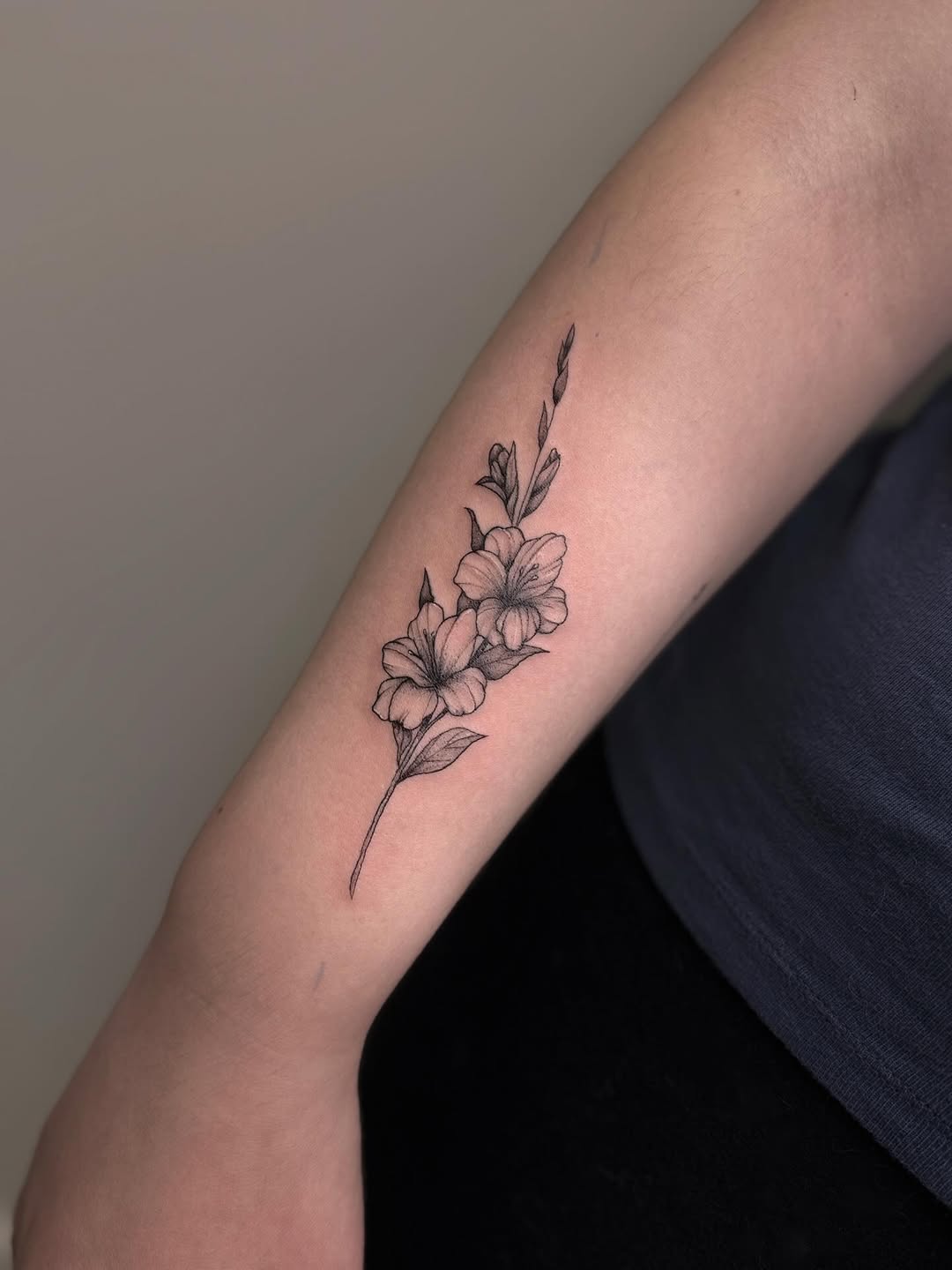 Delicate fine line floral tattoo featuring a slender botanical branch with softly shaded blossoms and leaves. Clean single-needle linework and subtle dot shading create a light, airy feel while preserving botanical detail. The vertical composition follows the natural flow of the forearm, giving the piece an elegant, minimalist presence. A timeless design focused on softness, precision, and refined simplicity.