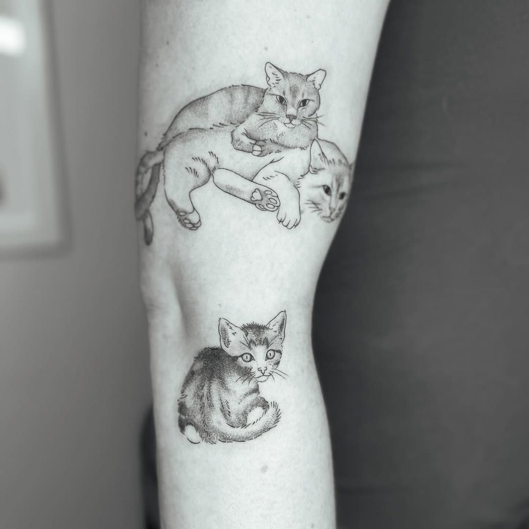 A charming fine line tattoo set featuring three cats captured in relaxed, natural poses. Two cats lounge together in a cozy stacked composition, while a third kitten sits below with a curious gaze. Soft linework and delicate shading create gentle texture and depth, giving the portraits a warm, affectionate feel. The minimalist black and grey approach keeps the piece elegant and timeless.