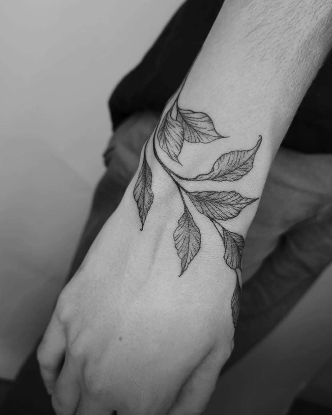 A graceful fine line tattoo featuring a slender branch with softly detailed leaves, designed to flow naturally along the contours of the wrist and forearm. The composition curves elegantly with the body, creating a sense of movement and harmony. Each leaf is delicately shaded with fine linework, adding depth while keeping the overall look light and refined. This piece blends minimalism with organic detail, making it a timeless choice for those who appreciate subtle, nature-inspired designs that complement the anatomy.