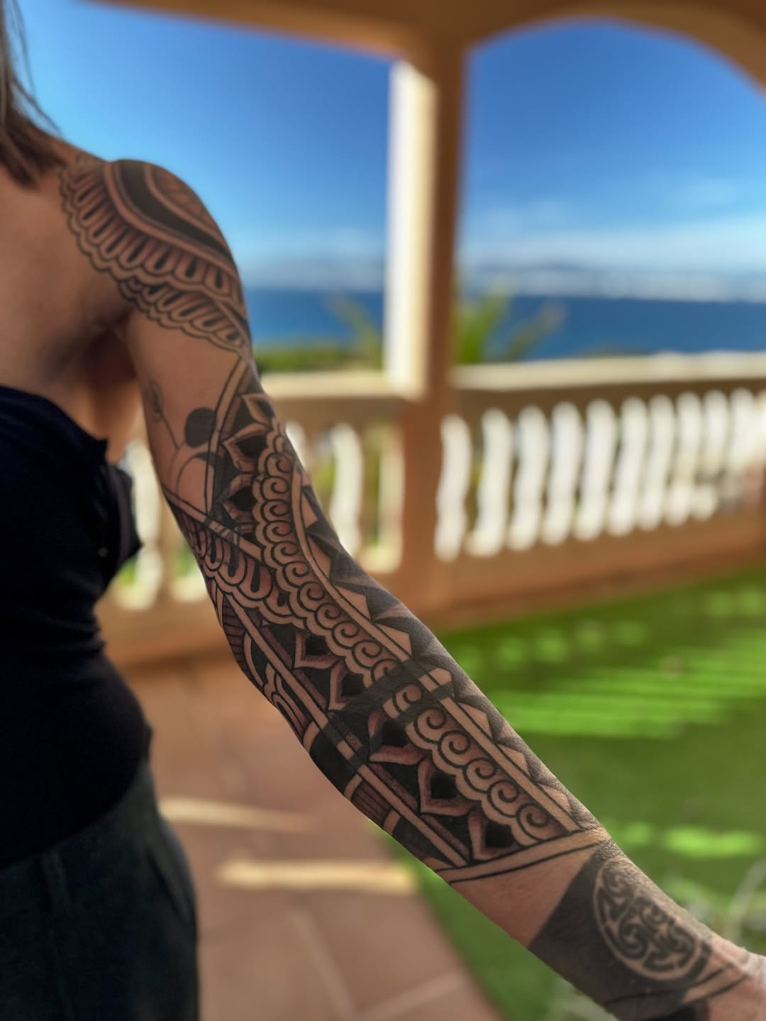 A structured ornamental sleeve that blends bold geometry with flowing decorative elements, creating a strong and modern visual identity. The composition starts with a circular mandala-inspired shoulder cap, acting as the focal point, and transitions downward into a sequence of patterns that wrap the arm with precision. The upper section features layered ornamental shapes that follow the shoulder anatomy, while the forearm introduces sharper geometric elements — including repeating triangles and linear bands — adding contrast and rhythm to the overall design. Heavy black fills are strategically placed to create depth and separation, giving the sleeve a powerful graphic look while maintaining clarity from a distance. The balance between solid areas and open skin ensures the tattoo doesn’t feel overcrowded, even with its complexity. This piece stands out for its clean transitions and strong structure, making it both visually impactful and highly wearable. It works as a complete sleeve while also leaving room for future extensions if desired.