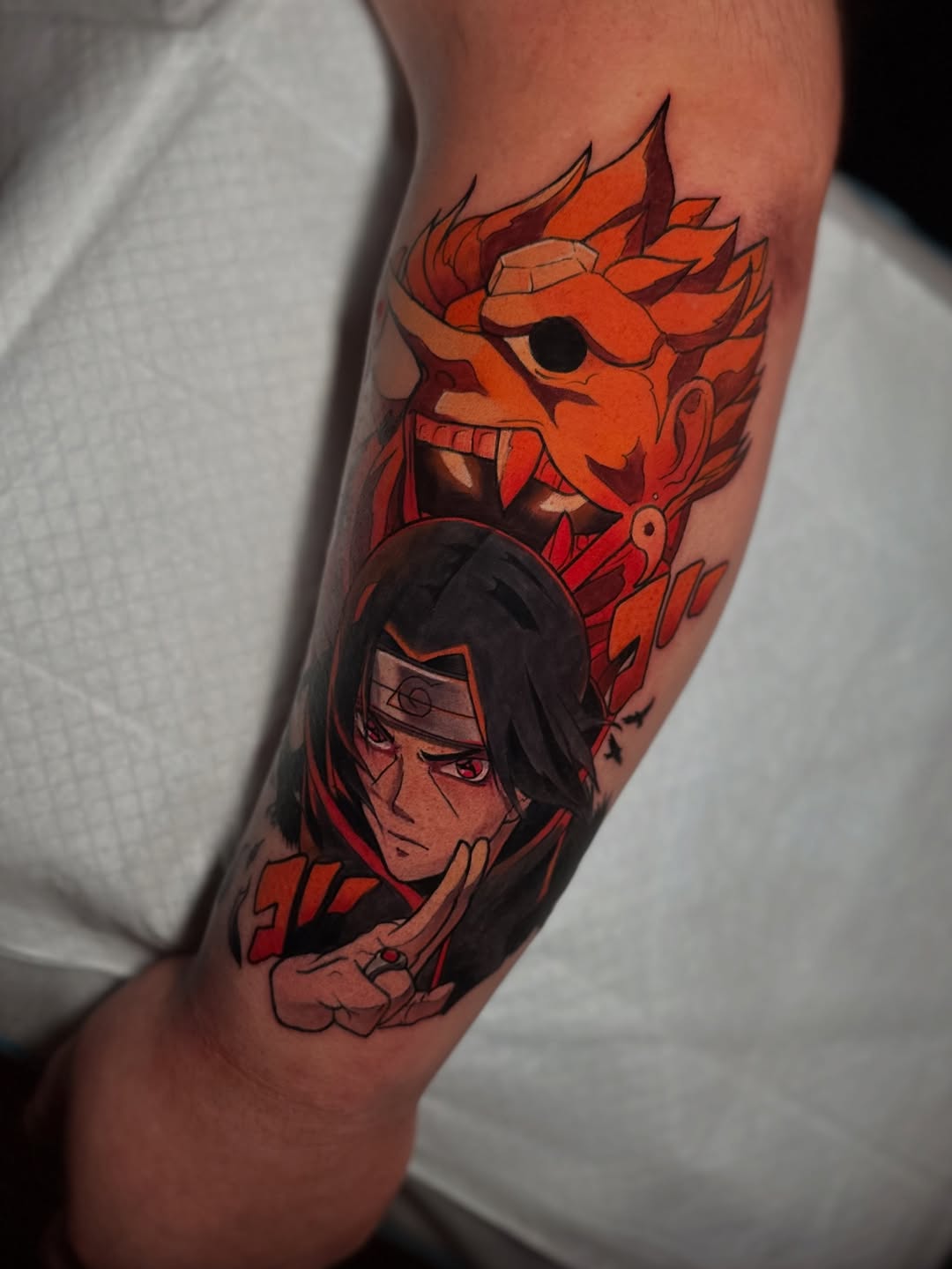 A bold color anime tattoo featuring a dramatic stacked composition of a calm shinobi portrait layered beneath a fierce spectral guardian mask. The design uses strong silhouette contrast and dynamic vertical flow to fit the limb naturally while keeping both characters instantly readable. Saturated reds and fiery oranges dominate the palette, reinforced with deep blacks and smooth gradients that create cinematic depth. Clean linework defines facial features and armor details, while soft color blending and subtle highlights give the piece a polished, high-impact manga aesthetic with powerful visual presence.