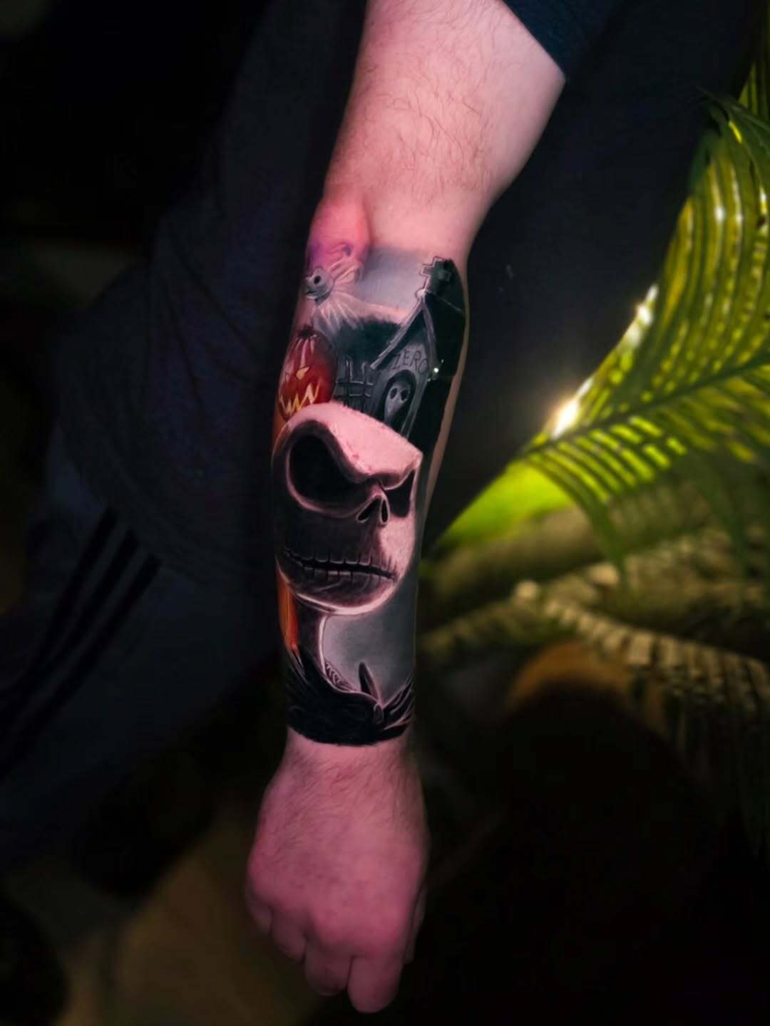 A bold and atmospheric black and grey tattoo inspired by The Nightmare Before Christmas, featuring Jack Skellington as the central figure. The design captures his iconic skull face with smooth shading and crisp contrast, giving the piece a clean yet dramatic look. Behind him, subtle Halloween elements—such as a haunted house and pumpkin accents—add depth and storytelling, blending spooky charm with a cinematic feel. The composition is vertically aligned to fit the forearm perfectly, with strong blacks and soft gradients enhancing readability from a distance. This piece balances cartoon-inspired design with realism in shading, creating a unique fusion of nostalgic character art and modern tattoo technique.