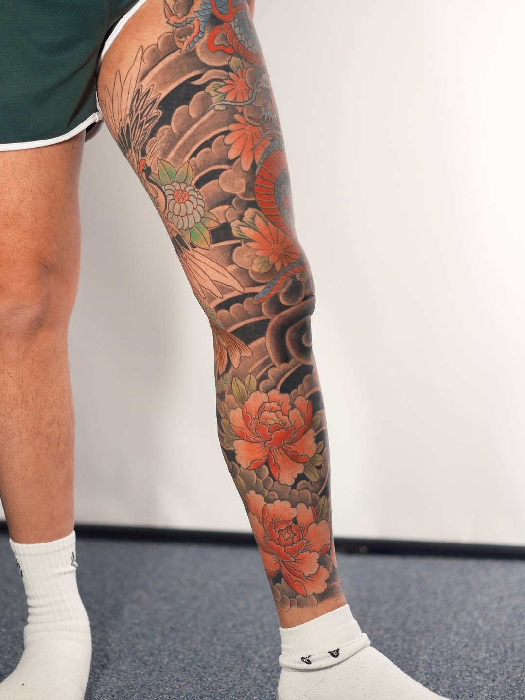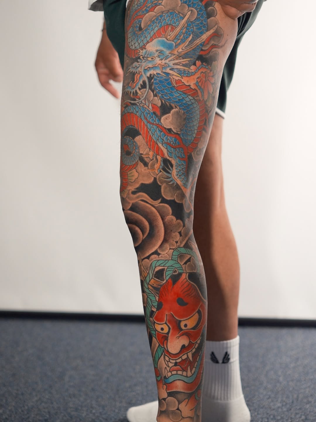 Large-scale Japanese-inspired leg sleeve featuring a powerful blue dragon flowing through storm clouds and a bold red Oni mask anchoring the lower leg. Rich traditional color palette, strong black outlines, and smooth gradient shading create depth and movement across the entire composition. The dynamic flow follows the natural anatomy of the leg, blending mythological symbolism with classic Irezumi aesthetics for a cohesive, high-impact statement piece.
