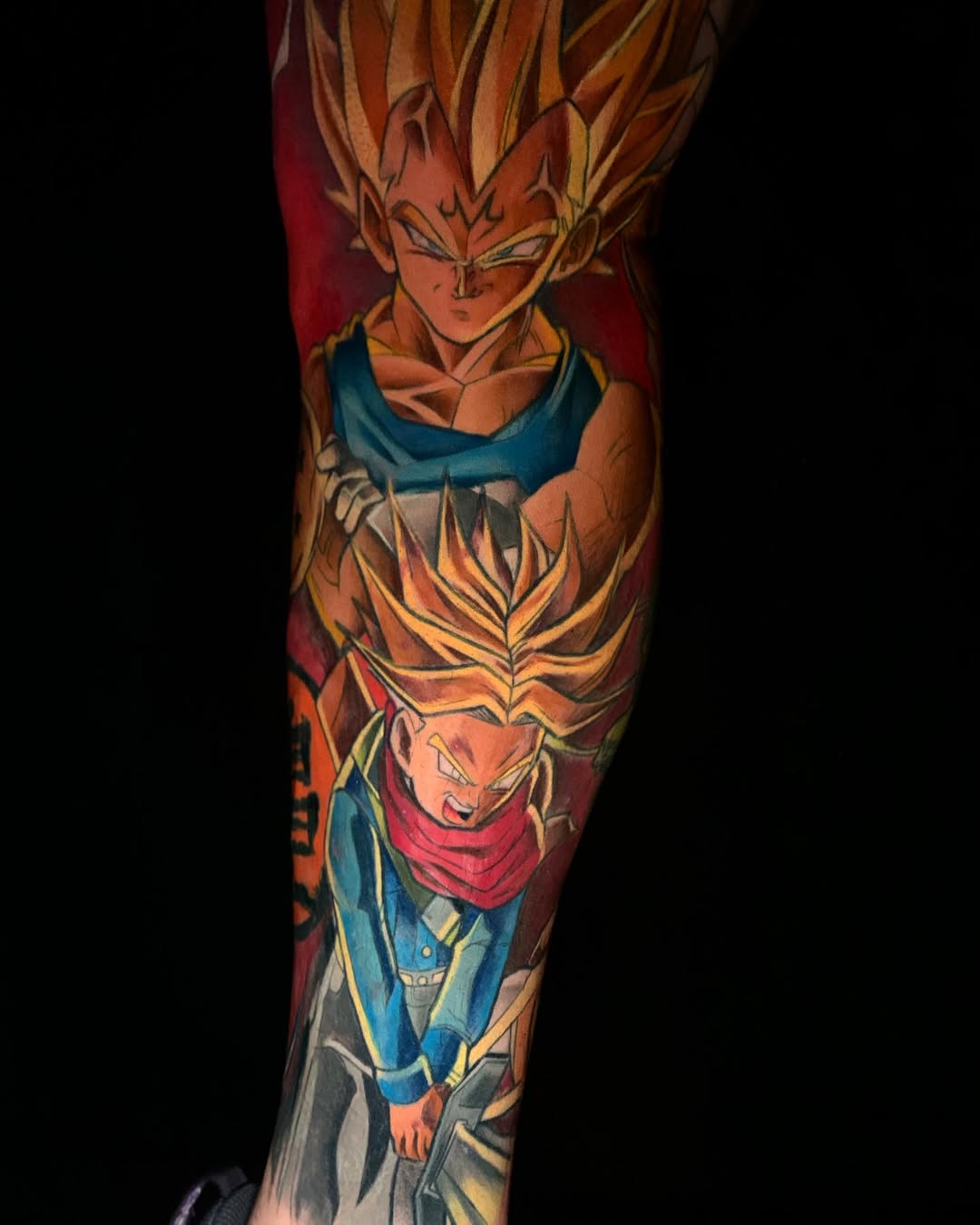 A vibrant anime tattoo capturing the powerful presence of Majin Vegeta in his Super Saiyan form. The characterβs intense expression and iconic spiked golden hair dominate the composition, highlighted by bold color saturation and dynamic shading. The glowing red background amplifies the sense of energy and battle-ready tension, while the layered composition suggests the progression of power within the Dragon Ball universe. Clean manga-style linework and vivid colors bring the character to life, creating a striking tribute to one of the most iconic transformations in anime history.