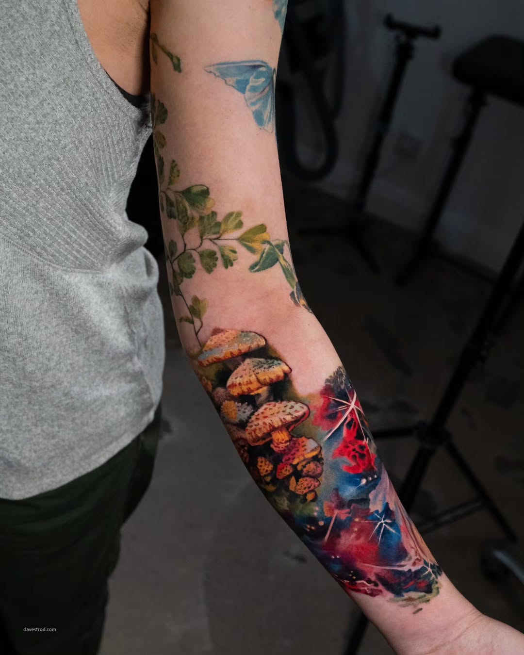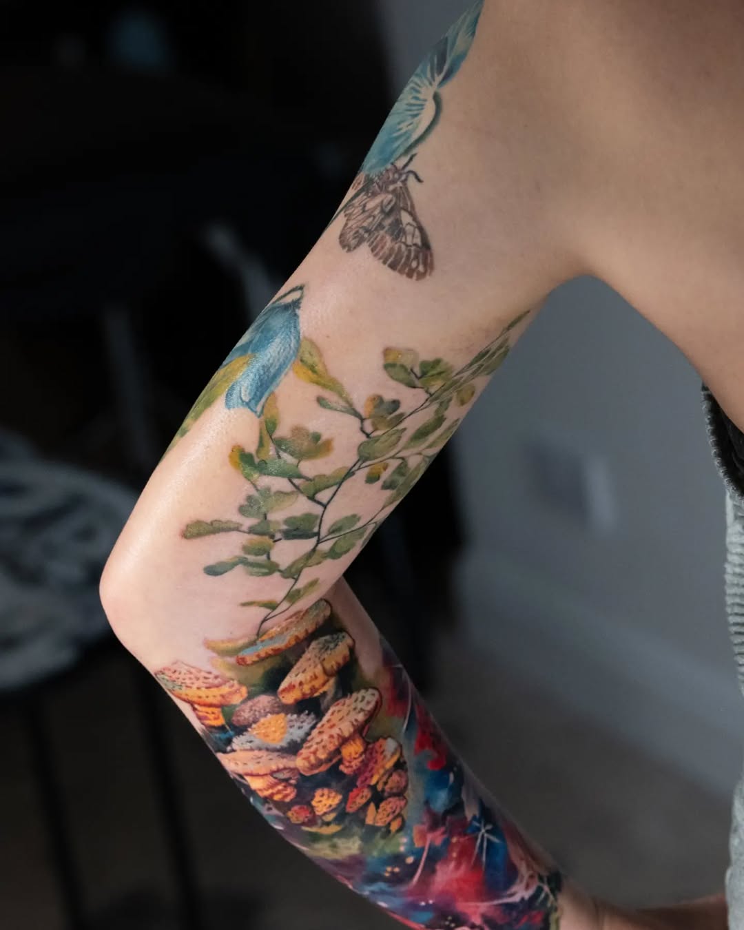 A vibrant nature-inspired sleeve combining delicate botanical branches, detailed mushrooms, butterflies, and soft atmospheric color transitions. The piece blends hyper-detailed micro elements with painterly backgrounds, creating depth and a living forest mood. Fine textures, realistic color gradients, and organic flow make the composition feel immersive and natural.