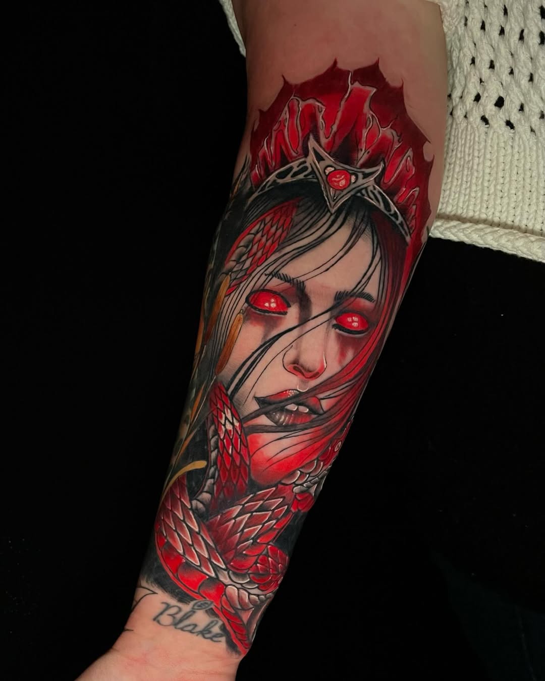 A striking neo traditional tattoo featuring a mysterious queen with glowing red eyes, surrounded by dark, mystical elements. The woman wears a crown adorned with a red gem, symbolizing power, authority, and inner strength. Her expression is calm yet intense, while strands of hair flow across her face, adding movement and drama to the composition. A red serpent coils around her neck and shoulders, representing transformation, danger, and hidden knowledge. The deep red highlights and bold black shading create a powerful contrast, giving the piece a dark fantasy atmosphere inspired by gothic and mythological themes.