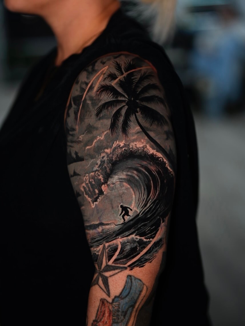 A dramatic black and grey tattoo capturing the power of the ocean with a surfer riding inside a massive curling wave. The composition blends dynamic water movement with atmospheric shading to create a cinematic seascape across the shoulder. At the top, palm trees and stormy clouds add depth and tropical atmosphere, while lightning-like highlights illuminate the wave’s texture. The surfer appears as a silhouette within the barrel, emphasizing the scale and energy of the wave. The design represents freedom, adventure, and the deep connection between humans and the ocean.