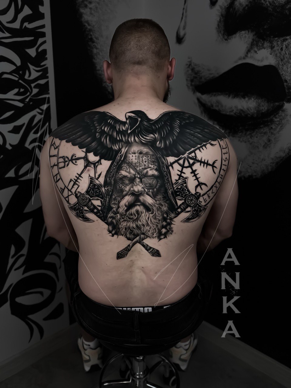 A bold black-and-grey full back tattoo inspired by Norse mythology, centered around a powerful portrait of Odin—the Allfather. His weathered face, marked with age, wisdom, and sacrifice, becomes the core of the composition, symbolizing knowledge gained through hardship. Above him, a raven spreads its wings across the shoulders, creating a strong horizontal flow and reinforcing Odin’s connection to thought and memory. The wings naturally follow the anatomy of the back, giving the piece a commanding presence. Surrounding elements—Viking axes, runic symbols, and circular patterns—build a layered narrative of war, destiny, and ancient belief. The runes and textures add depth and storytelling, while the balanced symmetry keeps the composition clean and powerful. Deep blacks and controlled highlights bring the entire piece to life, blending realism with symbolic detail. This tattoo embodies strength, wisdom, and the spirit of a warrior guided by higher knowledge.