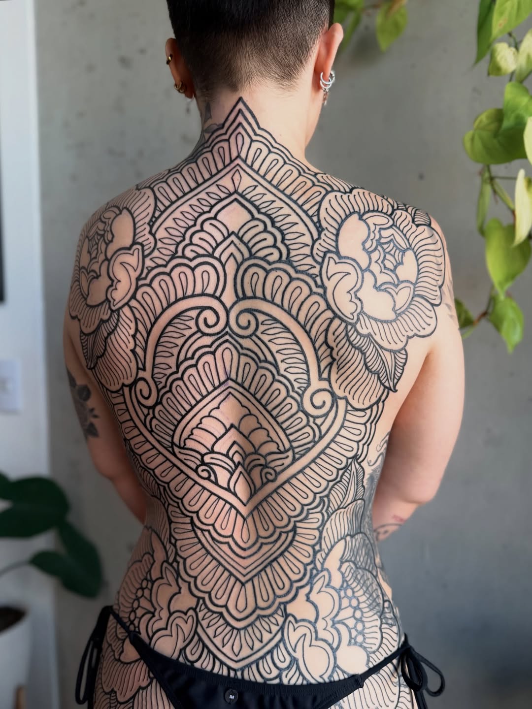 A large-scale ornamental back piece built around a central mandala that anchors the entire composition. The design expands symmetrically across the back, flowing naturally with the body’s structure and enhancing the silhouette. Clean, bold linework defines each layer, while repeating ornamental elements create depth and rhythm throughout the piece. The absence of heavy shading keeps the tattoo light and breathable, allowing the intricate patterns to stand out with clarity and precision. The composition extends outward with floral-inspired motifs, softening the geometric core and adding balance between structure and organic flow. Every section connects seamlessly, making the tattoo feel like a single, unified design rather than separate elements. This piece is a strong example of how scale, symmetry, and flow can transform ornamental work into a powerful statement on the body.