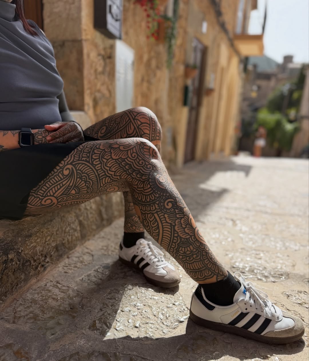 A bold full-leg composition built with intricate ornamental patterns that flow seamlessly across both legs. The design is entirely freehand, allowing it to perfectly follow the natural anatomy and create a cohesive, body-contouring effect. The piece combines dense linework with repeating motifs, giving it a rhythmic, almost hypnotic visual structure. Each section connects organically, creating movement from thigh to ankle without any visual breaks. Subtle negative space is used strategically to balance the complexity and let the skin breathe. A hidden skull element adds a darker, symbolic layer to the design—contrasting with the otherwise decorative flow and giving the piece more depth and personality. This tattoo stands out for its precision, consistency, and flow, showcasing how ornamental work can transform the body into a living canvas.
