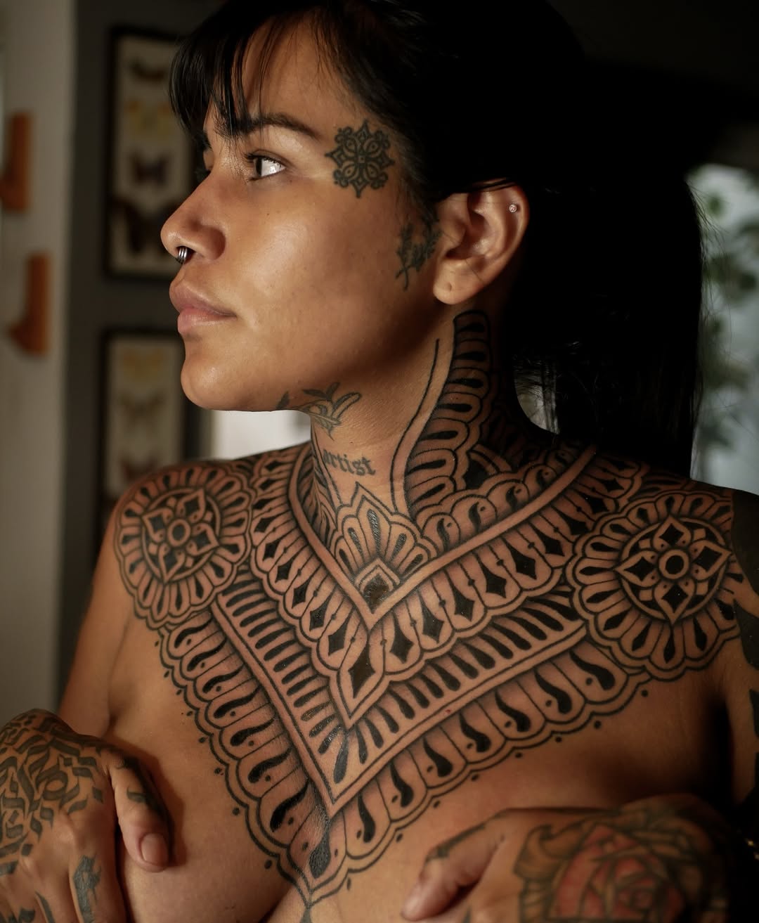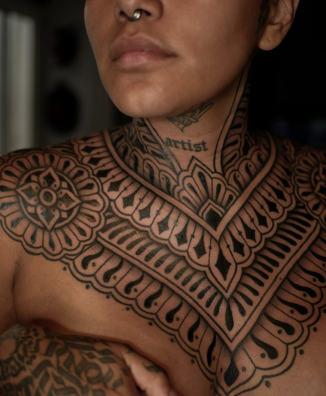 A striking ornamental composition that frames the collarbones and extends seamlessly into the neck, creating a bold yet elegant upper-body piece. The design is built around structured, layered patterns that sit perfectly along the natural lines of the shoulders and chest. Strong black accents are balanced with fine linework and dot shading, giving the tattoo depth without making it feel heavy. The symmetrical layout enhances the body’s structure, while the flowing edges soften the geometry and add movement. The extension onto the neck is handled with precision — following vertical lines that elongate the silhouette and connect the entire piece into one cohesive flow. Every detail is carefully spaced, allowing the design to remain clean and readable even in such a high-visibility area. This tattoo stands out for its placement and execution — a perfect blend of bold structure and delicate ornamentation, designed to complement the anatomy.