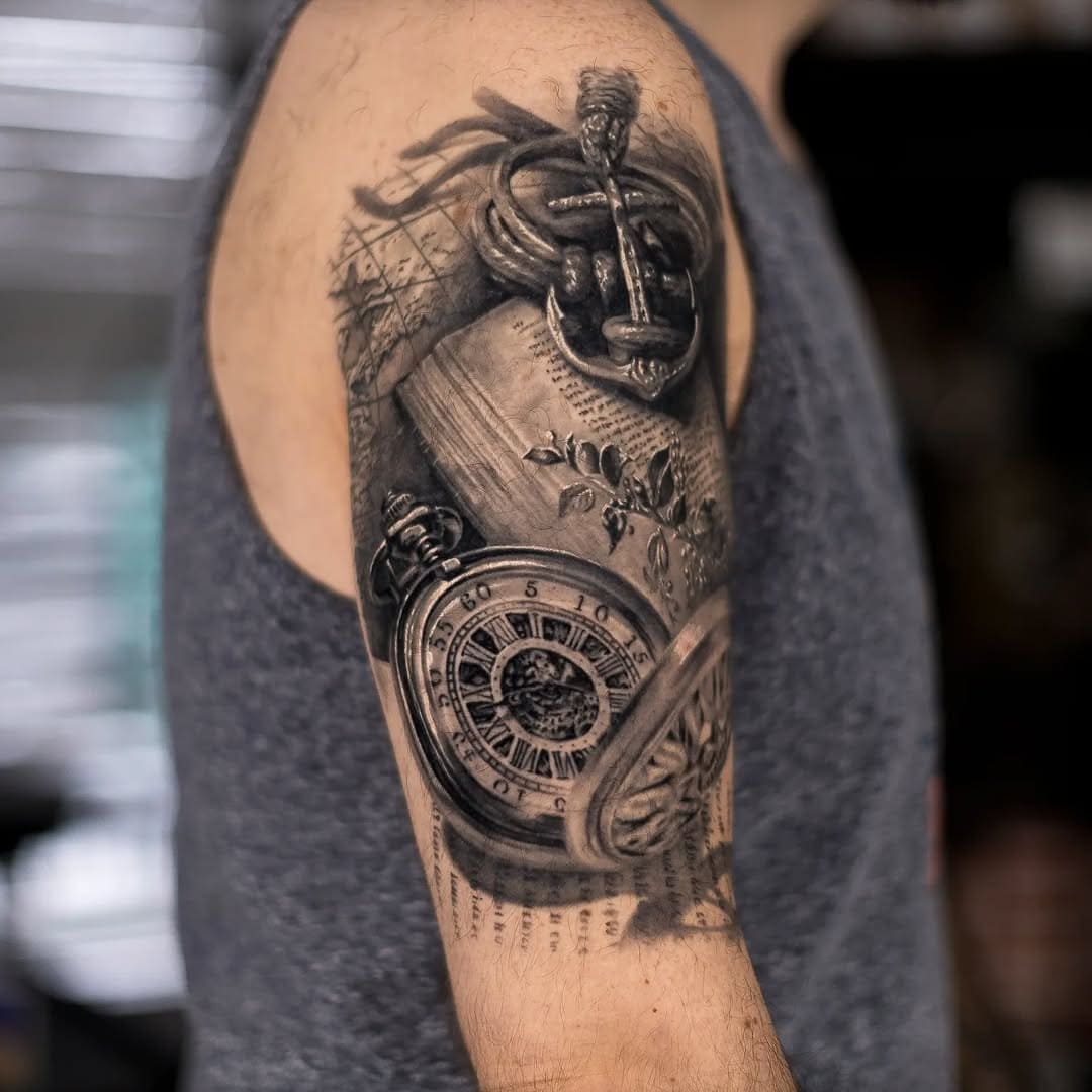 A detailed black and grey realism tattoo combining classic symbolic elements of time, knowledge, and strength. The composition features a vintage pocket watch with intricate Roman numerals and mechanical details, rendered with smooth shading that gives the piece a strong three-dimensional appearance. Above the watch, an antique dagger wrapped with a rope adds a sense of power and tension, while an open book and scattered pages create a narrative feeling, symbolizing wisdom, memory, and the passage of time. Fine textures, subtle background shading, and layered elements blend together to form a cohesive design that flows naturally across the upper arm. The tattoo captures the timeless theme of life’s fleeting moments and the stories that shape our journey.