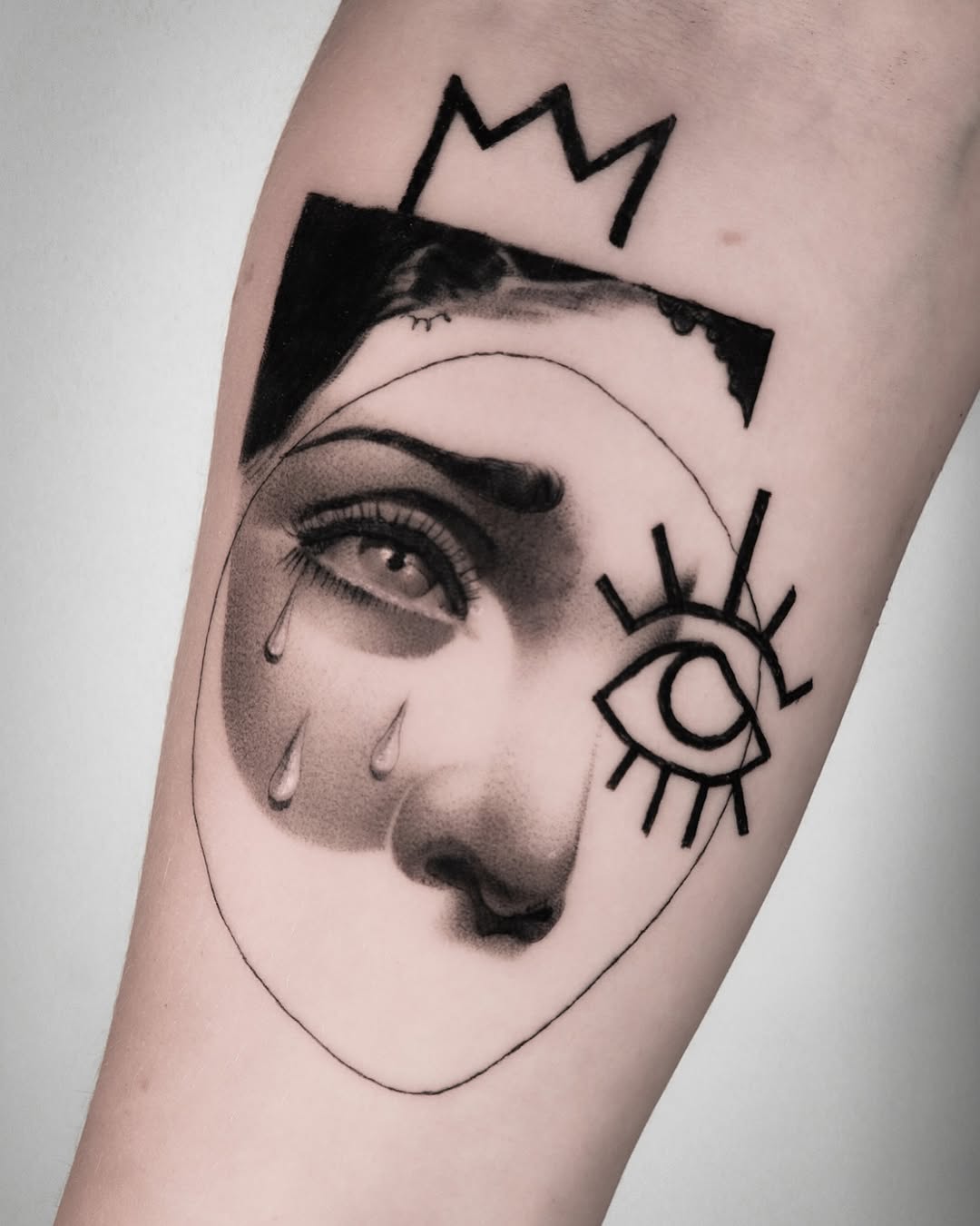 Un tatouage surréaliste moderne en noir et gris qui associe un portrait réaliste à un symbolisme graphique audacieux. La pièce maîtresse présente un fragment de visage féminin classique, subtilement ombré, centré sur un œil détaillé, avec de délicates larmes qui ajoutent une profondeur émotionnelle. Des dégradés doux de micro-réalisme créent une texture de peau réaliste et un ombrage dimensionnel. Le portrait est encadré par un contour ovale minimaliste, traversé par des éléments graphiques noirs marqués — un symbole de couronne au-dessus et un œil illustratif stylisé sur le côté — apportant du contraste et un langage visuel contemporain. La composition équilibre le minimalisme en fine line avec un fort espace négatif et des formes noires audacieuses, créant une esthétique d’art moderne à la fois épurée et expressive.