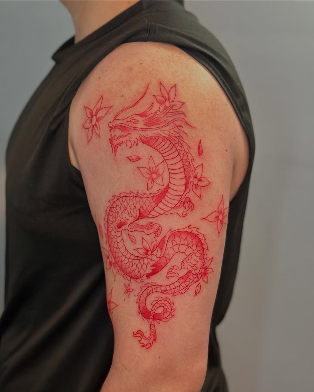 A bold red linework tattoo featuring a traditional-style dragon flowing along the upper arm. The dragon’s body curves dynamically, with finely detailed scales, sharp claws, and an expressive head that conveys strength and movement. Surrounding the dragon are delicate floral elements that soften the composition and create visual balance against the powerful creature. Executed entirely in red ink, the design stands out with a striking and modern aesthetic while still drawing inspiration from classic Eastern dragon symbolism. The placement on the upper arm allows the dragon’s serpentine body to follow the natural contours of the muscle, creating a strong and fluid composition. Dragons are often associated with power, wisdom, and protection, making this piece both visually dramatic and symbolically rich.