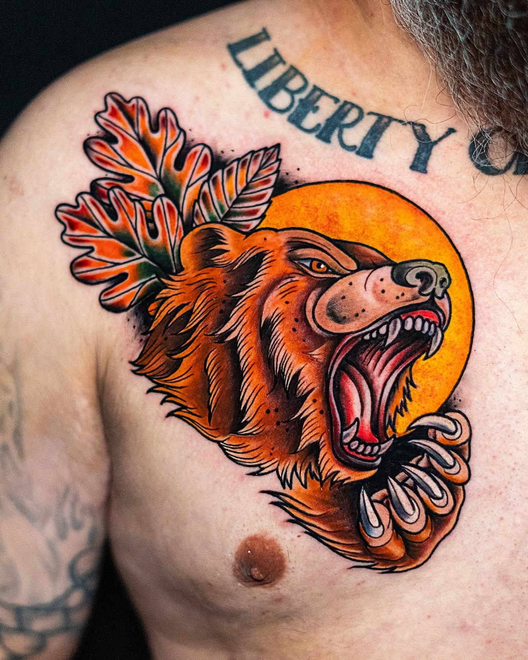 A powerful neo-traditional piece featuring a roaring grizzly bear head with jaws wide open and claws forward in an aggressive defensive pose. Rich warm tones, bold black outlines, and smooth gradient shading give the design strong depth and impact. Autumn leaves frame the composition while a solid sun circle adds contrast and balance, creating a striking, high-energy wildlife statement.