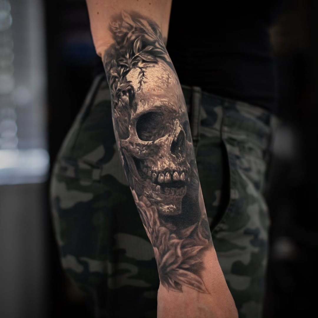 A striking black and grey tattoo featuring a highly detailed human skull surrounded by organic leaf elements. The skull is rendered with textured bone surfaces, subtle cracks, and deep shadows that create a strong three-dimensional effect. Above the skull, leaves and natural shapes emerge from the composition, adding contrast between life and decay. The lower part of the design transitions into flowing foliage that blends smoothly into the forearm, helping the tattoo follow the natural anatomy of the arm. The combination of realistic shading, fine textures, and natural elements creates a powerful visual balance between mortality and nature, resulting in a bold dark realism tattoo.