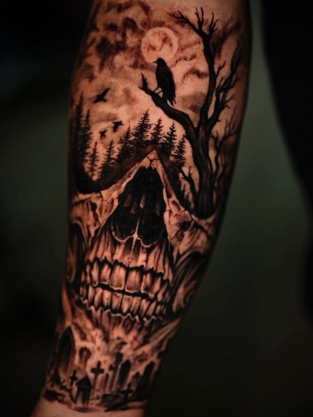 A dark and atmospheric black and grey tattoo combining themes of life, death, and mystery. The centerpiece is a detailed skull that seamlessly blends into a haunting forest landscape growing from within it. Above the skull, a raven sits on a barren tree branch beneath a glowing full moon, while birds fly through the night sky. The forest silhouettes emerging from the skull create a surreal transition between nature and mortality. At the bottom, subtle cemetery elements reinforce the gothic atmosphere. The design symbolizes the cycle of life and death, inner darkness, and the connection between nature and the unknown.