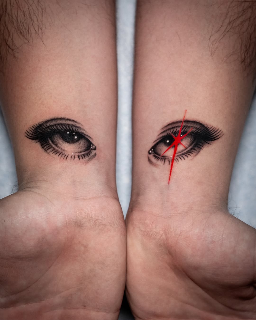 A detailed black-and-grey realistic eye tattoo capturing soft shading, clean eyelash work, and natural depth. The composition is elevated by a sharp red starburst overlay crossing the pupil, creating a bold graphic contrast against the realism. Minimal placement and strong focal point make it visually striking while keeping the design clean and modern.