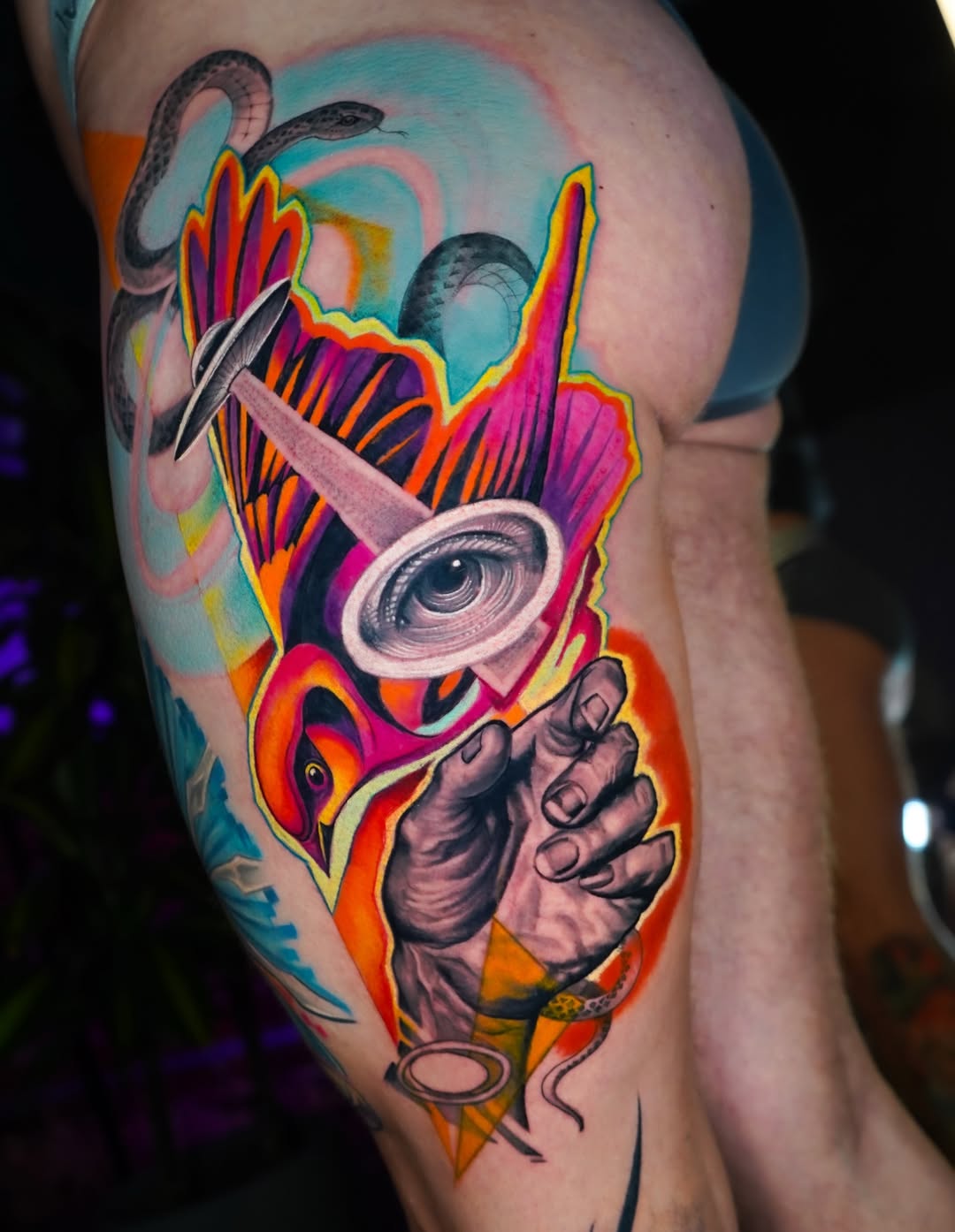 A bold neo-contemporary collage merging realism with explosive color abstraction. A finely rendered monochrome hand reaches forward beneath a surreal eye housed in a megaphone-like form, creating a powerful focal point of perception and voice. Vivid neon gradients—magenta, cyan, electric orange, and acid yellow—radiate through layered organic shapes, while a coiling serpent weaves through the background, adding tension and symbolism. Crisp illustrative outlines contrast with soft airbrushed blends, producing depth, motion, and a striking mixed-media aesthetic that reads like a living mural on skin.