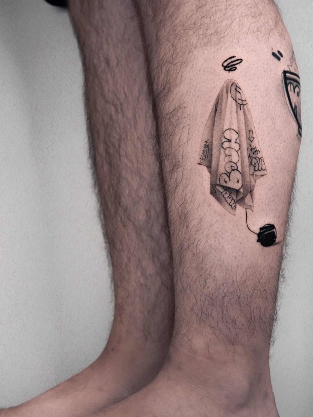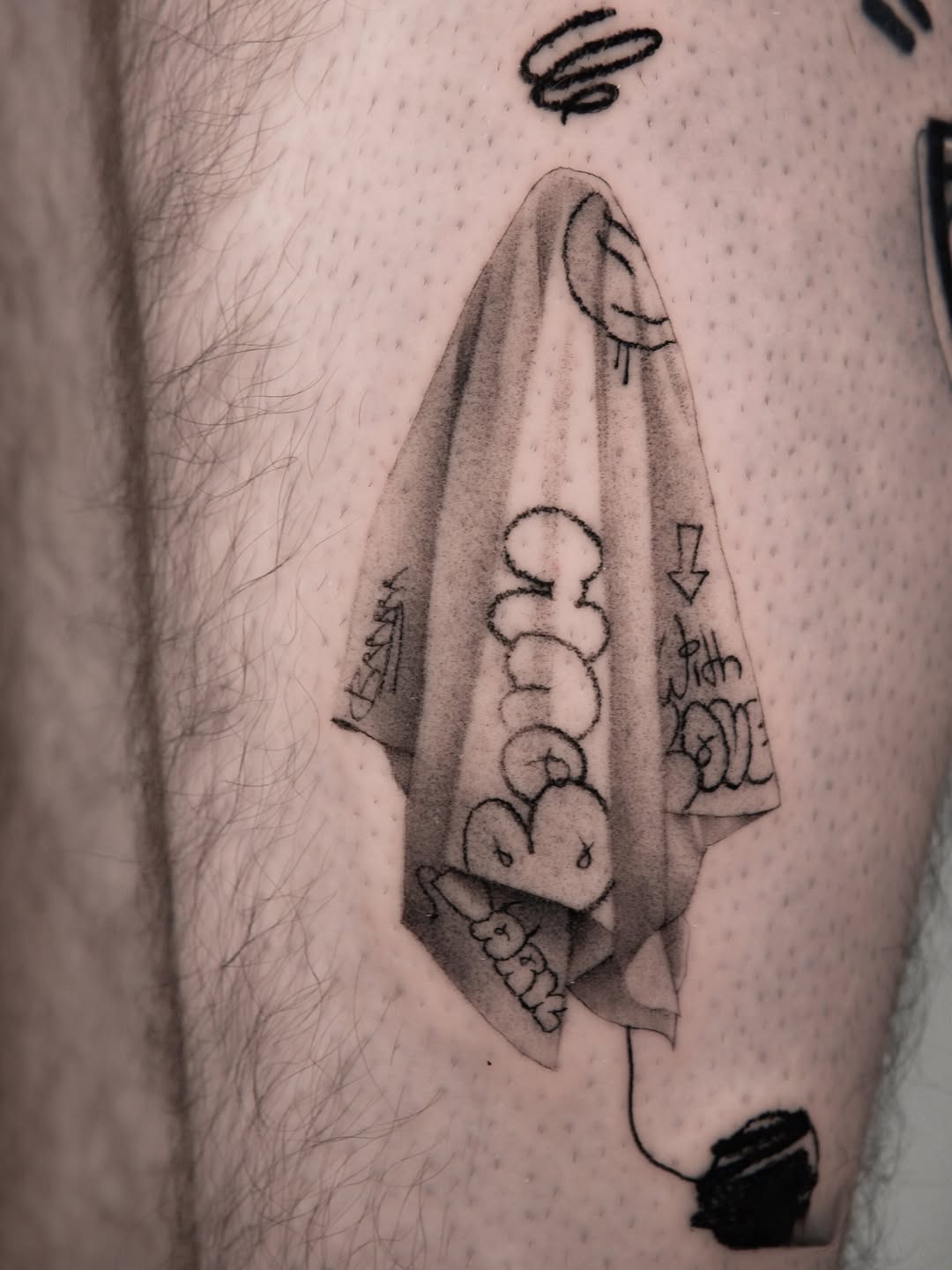 Un tatouage ludique en noir et gris représentant un personnage de fantôme flottant sous un drap, réalisé dans un style illustratif doux. Le fantôme tombe naturellement avec des dégradés fluides et une texture subtile en dotwork, créant une présence légère et aérienne sur la peau. Un lettrage audacieux de style graffiti traverse verticalement le centre, mêlant l’esthétique du street art au charme cartoon. De petits éléments graphiques — flèches, gribouillis et détails façon tag — ajoutent du mouvement et de la personnalité à la composition. La palette minimaliste et les contrastes doux gardent la pièce propre et lisible tout en conservant une ambiance urbaine moderne.