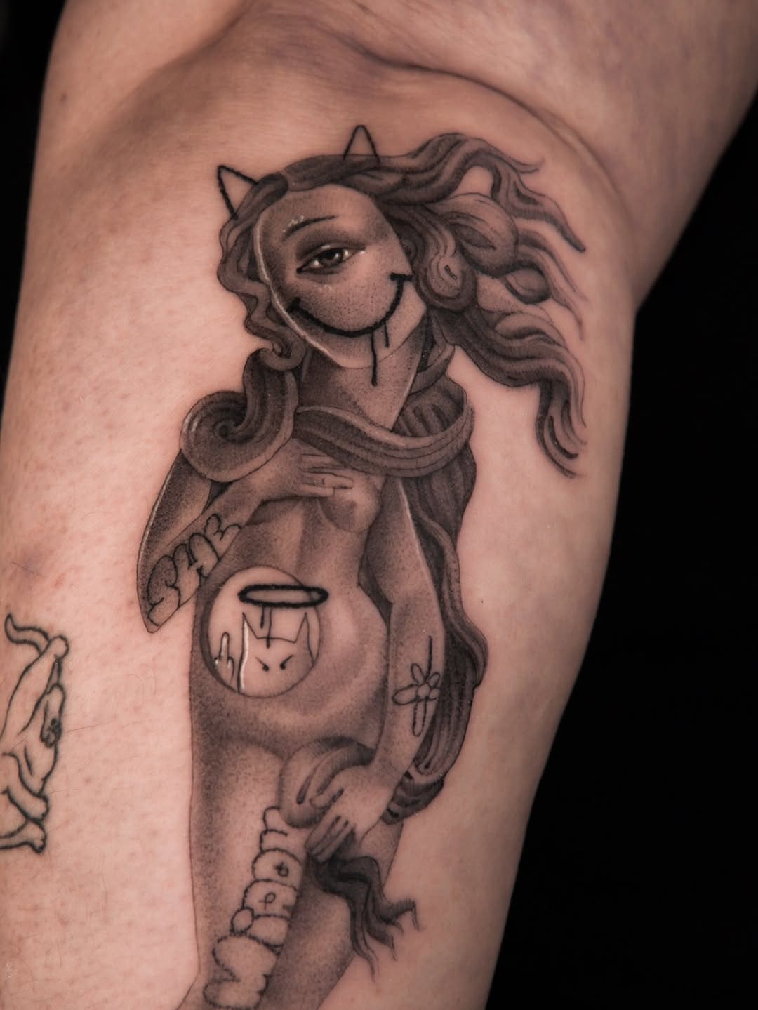 Un tatouage illustratif raffiné en noir et gris représentant une figure féminine stylisée inspirée de l’esthétique mythique et des muses classiques. Le personnage adopte une pose élégante, avec des cheveux fluides et des traits doux, mêlant un réalisme subtil à un linework influencé par le style cartoon. Des dégradés délicats et un ombrage lisse créent de la profondeur sur l’ensemble de la figure, tandis que des éléments symboliques minimalistes ajoutent une dimension narrative et un rythme visuel. La composition est légère et équilibrée, utilisant l’espace négatif pour souligner la silhouette et préserver la lisibilité sur la peau. Un motif de main en fine line, délicat et placé à côté de la figure, apporte une touche artistique façon carnet de croquis, renforçant le concept illustratif.