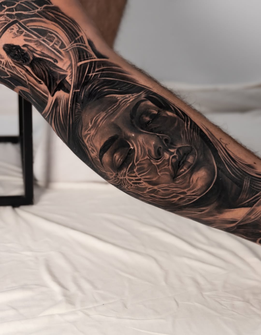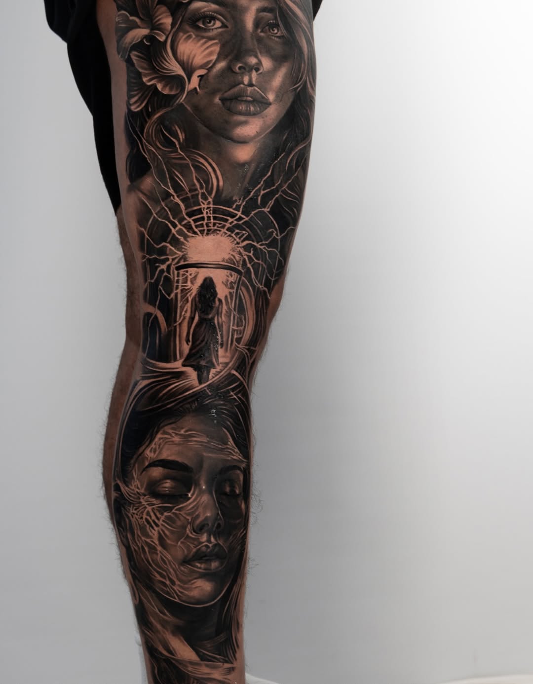 A full black and grey concept piece built over three consecutive days, designed as one continuous visual story. The composition flows through two female portraits connected by a central symbolic scene — a lone figure walking through a doorway toward light. The upper portrait feels present and aware, while the lower one appears calm and introspective, almost dreamlike. Between them, the glowing portal and branching, lightning-like lines create a sense of transition — representing change, memory, or inner transformation. Smooth gradients, precise facial detailing, and controlled contrast give the piece depth and realism, while the composition keeps the eye moving naturally from top to bottom. The storytelling element makes this more than just a sleeve — it feels like a personal narrative captured in ink.