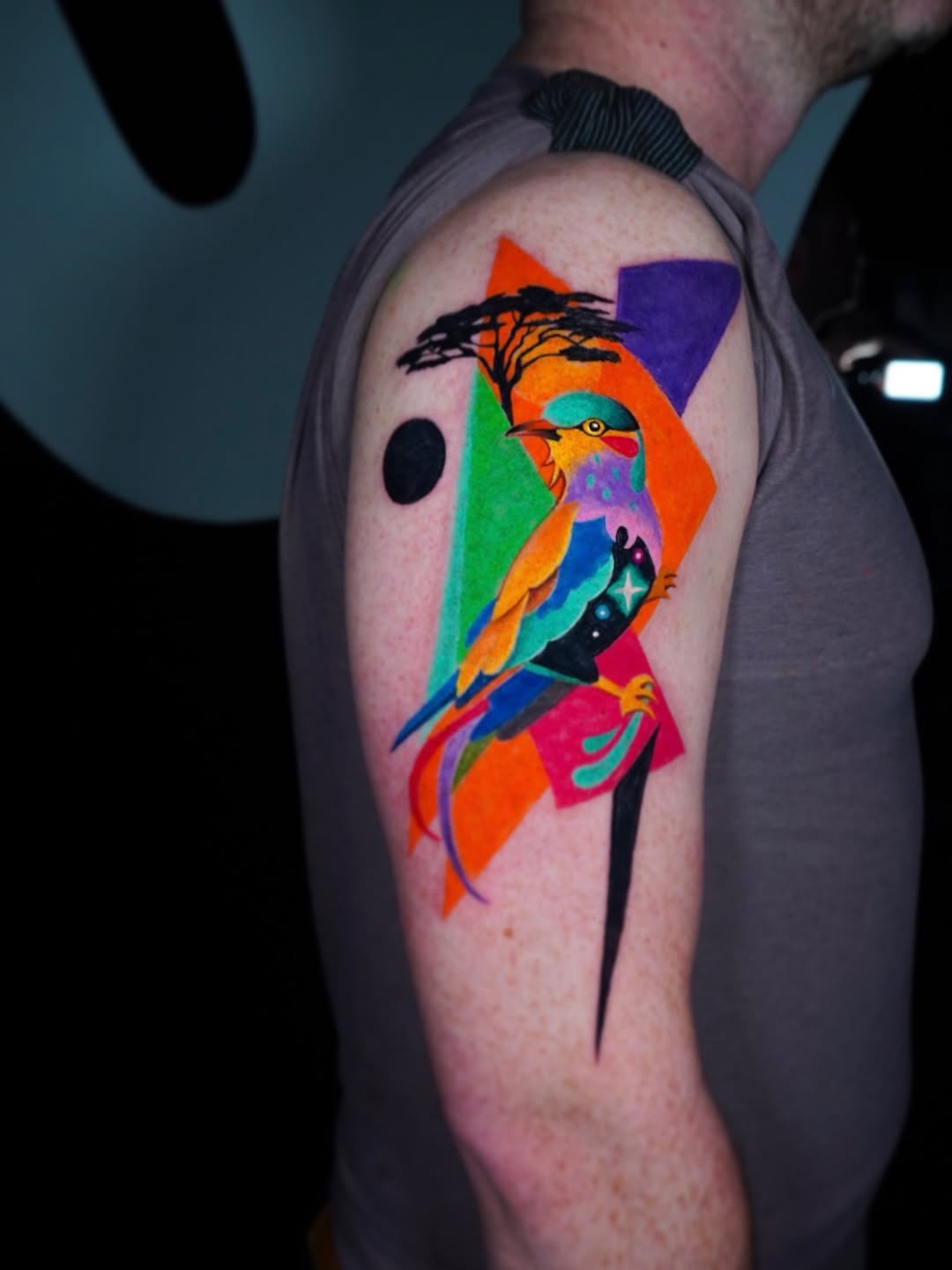 A bold, high-saturation color tattoo featuring a stylized exotic bird perched within dynamic geometric shapes. The composition blends neon gradients, abstract blocks of color, and sharp negative space for a modern graphic impact. A silhouetted acacia tree and a solid black circle add symbolic contrast, while galaxy-style detailing inside the wing introduces a cosmic, dreamlike dimension. The long tail and angled shapes create strong flow along the arm, giving the piece powerful movement and contemporary art energy.