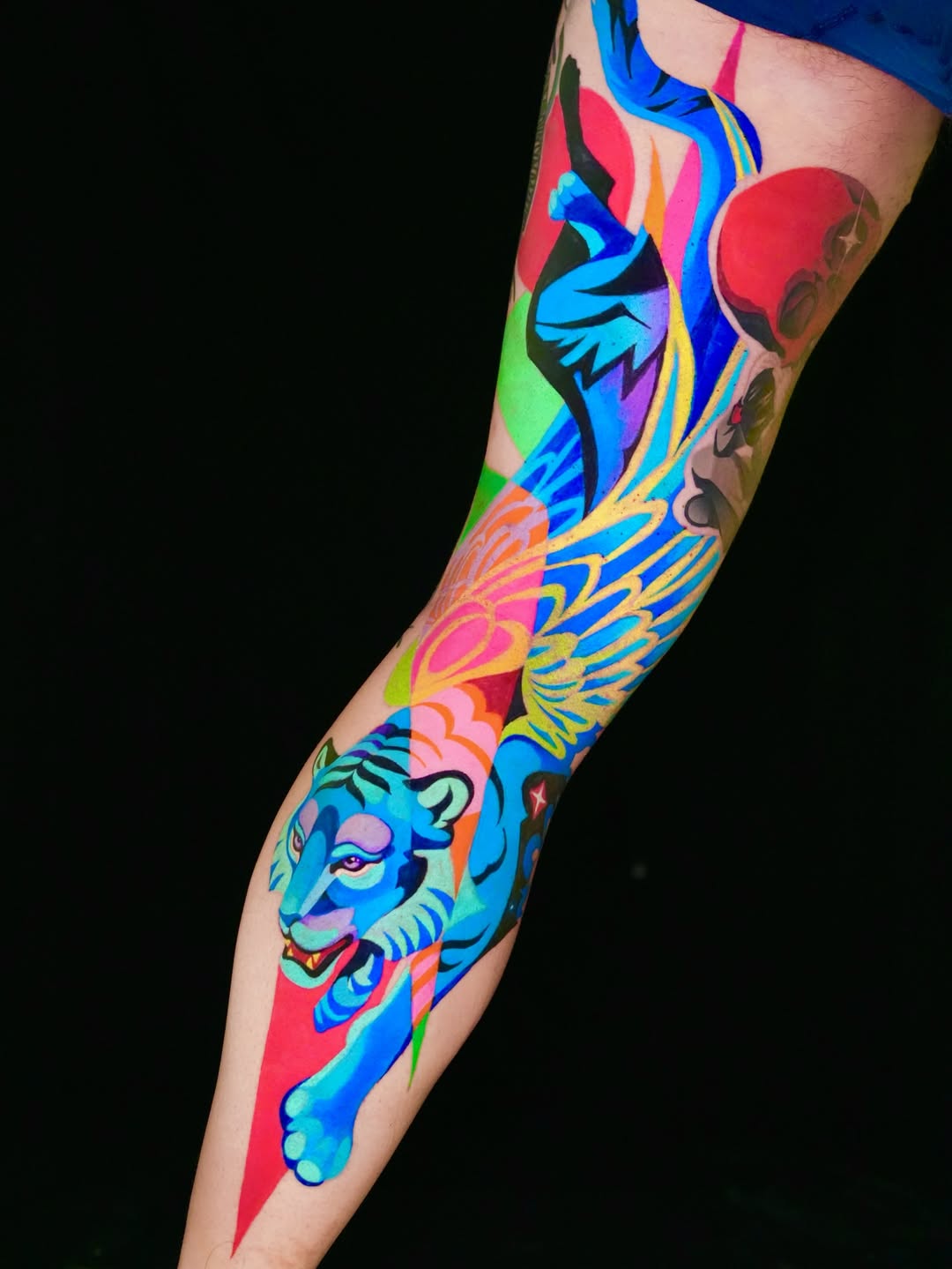 A bold, high-energy full sleeve built from saturated color blocking and dynamic geometric composition. The centerpiece features a stylized panther in motion, rendered with electric blues and teals, sharp graphic shadows, and expressive facial detailing. Surrounding elements—abstract wings, flowing shapes, and layered color planes—create strong movement across the arm, guiding the eye from shoulder to wrist. Clean vector-like linework, punchy gradients, and contrasting neon tones give the piece a modern illustrative impact while maintaining strong readability from a distance.