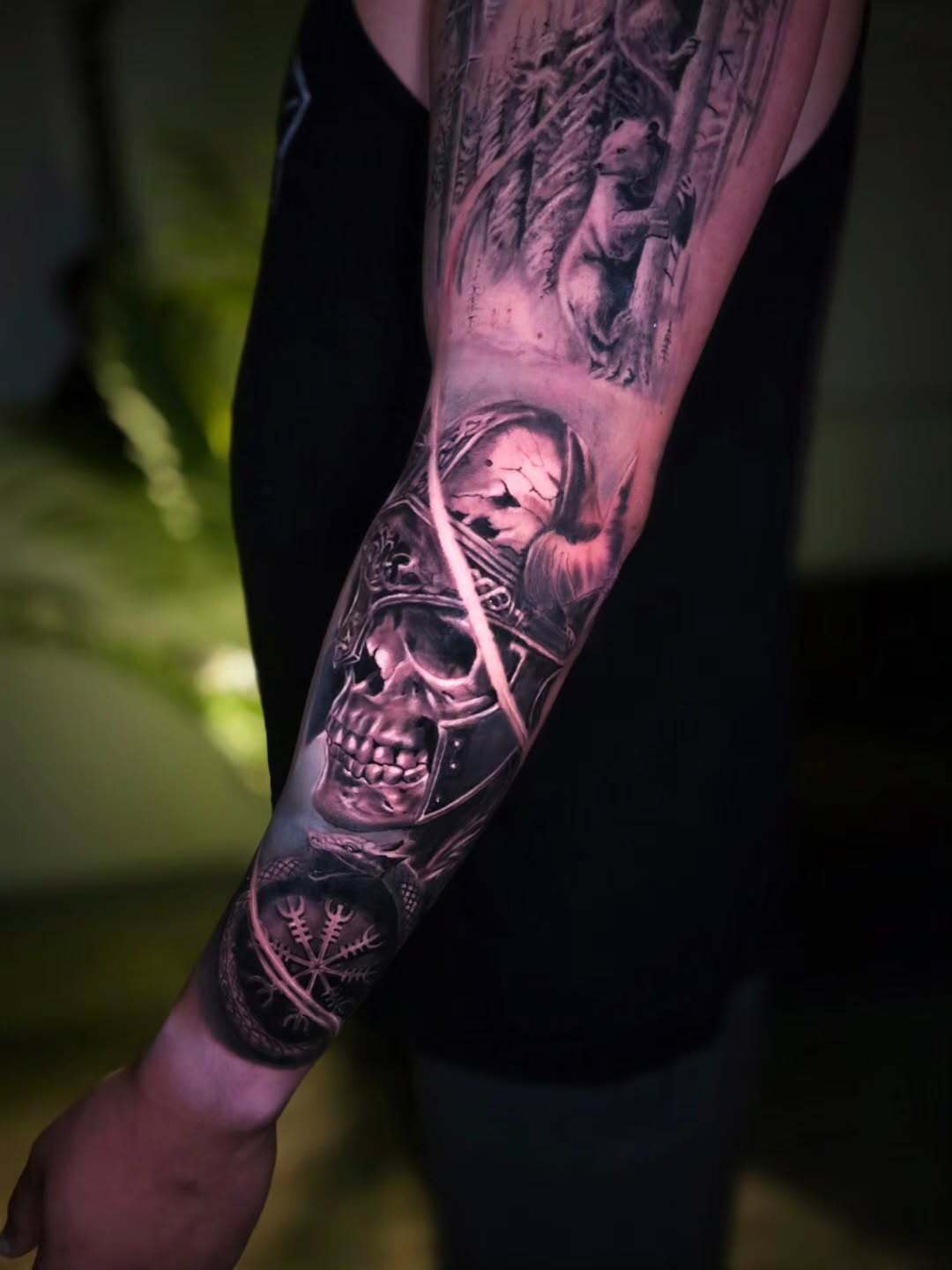 A striking black and grey sleeve that blends Norse symbolism with dark realism. The centerpiece features a detailed skull wearing a Viking helmet, intersected by a sharp blade that adds intensity and motion to the composition. Above, a bear climbing through a dense forest scene introduces a raw, primal energy, connecting themes of strength, survival, and nature. Subtle elements like runic symbols and ornamental details enhance the storytelling, while smooth gradients and high-contrast shading bring depth and realism. The entire piece flows seamlessly along the arm, creating a powerful and cohesive narrative from shoulder to wrist.