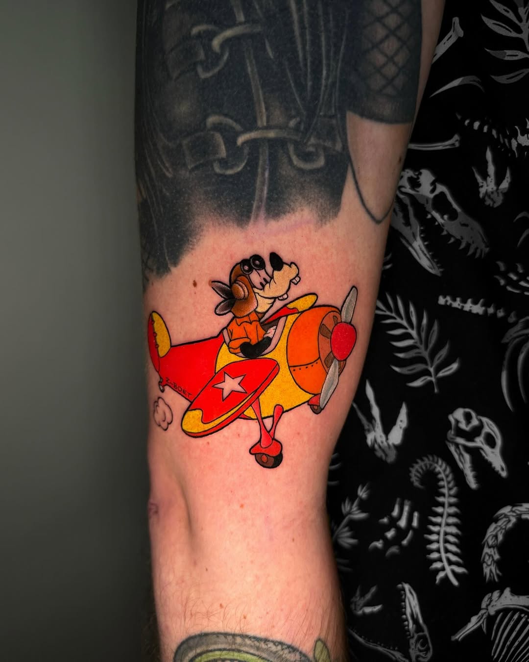 Playful vintage-style cartoon tattoo featuring a classic animated pilot flying a retro propeller airplane. The design captures old-school animation charm with bold outlines, flat saturated colors, and simplified shapes. Clean composition and nostalgic character styling make the piece feel lively, friendly, and instantly recognizable, while the bright red and yellow palette adds strong visual punch.