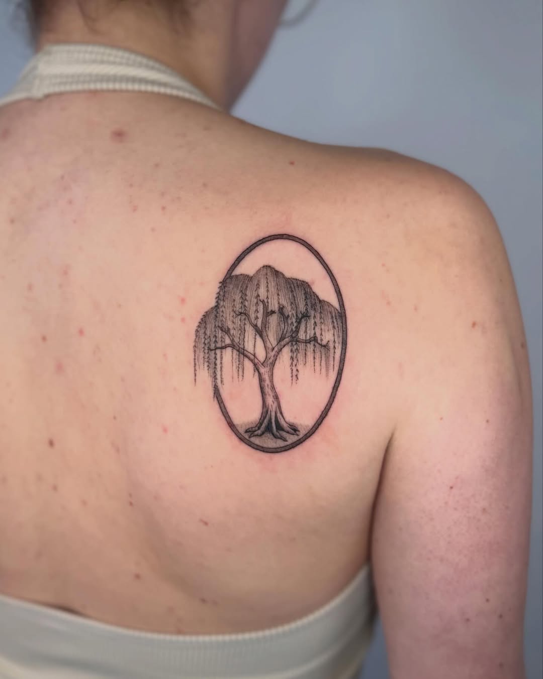 A delicate black and grey tattoo featuring a graceful willow tree enclosed within a simple oval frame. The design captures the elegant, flowing branches of the willow as they cascade downward, creating a soft and calm visual rhythm. Fine linework and subtle shading give the tree a natural texture while maintaining a minimalist aesthetic. Small birds perched on the branches add a quiet sense of life and serenity to the composition. The oval frame brings balance and structure to the design, giving it the appearance of a timeless botanical illustration. Symbolically, the willow tree often represents resilience, renewal, and inner strength.